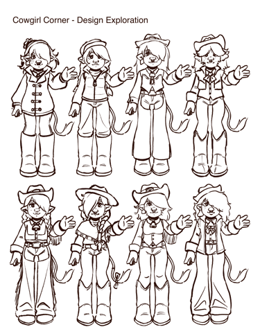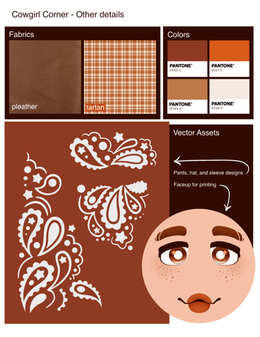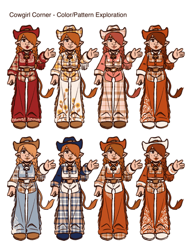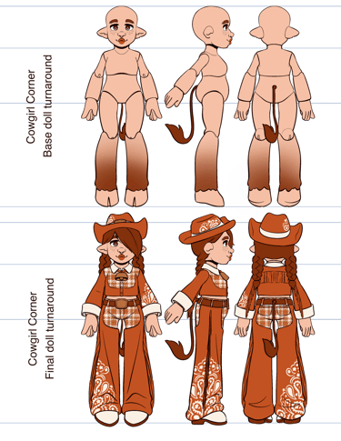 Cowgirl Corner is a doll line concept that celebrates historical aesthetics of the rural Americas. Maisie, the first doll designed for this line, is a Scottish Rancher turned American Cowgirl. She's based on a highland cow, so her color palette consists primarily of reds, oranges, and browns.