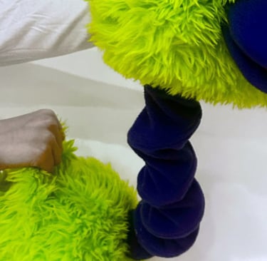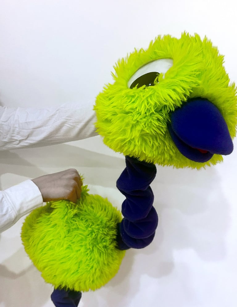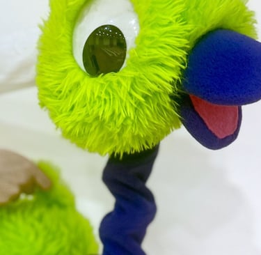 Named for his springlike legs and neck, Curly is a somewhat stupid but very enthusiastic flightless bird. He glows under a blacklight and can be puppeteered one or two-handed.