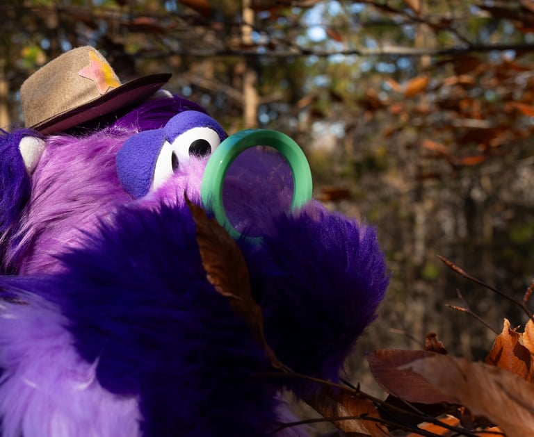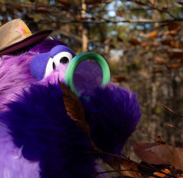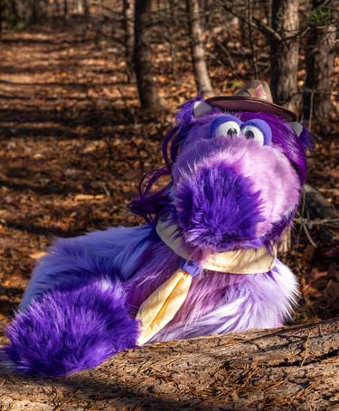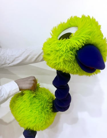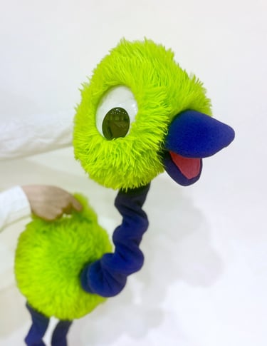 Named for his springlike legs and neck, Curly is a colorful puppet based on a flightless bird. He glows under a blacklight and can be puppeteered one or two-handed.